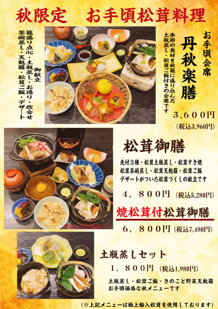 2025.09.11 秋限定メニュー始めました! Post Share Hatena LINE RSS feedly Pin it note 鮎・鱧単品メニュー始まりました 今年もやります!松茸と丹波牛食べ放題!(要予約)